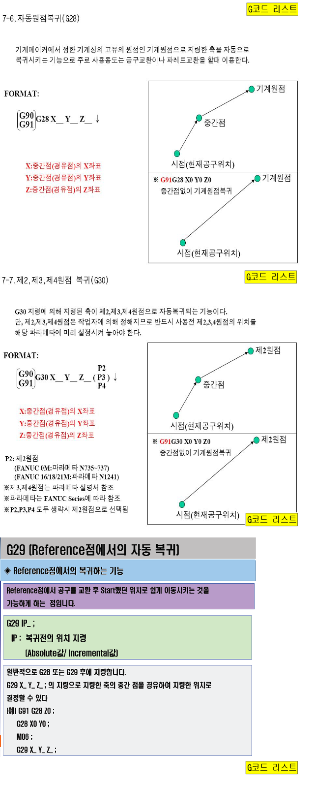 | G28 | 기계원점 복귀 | G28 G91 X_. Y_. Z_. ; | ||