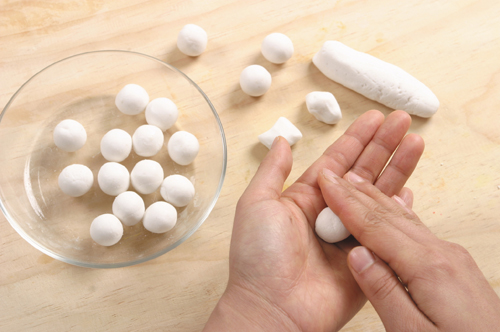 Formar bolitas de 1.5 cm. de diámetro (4~5 gr. cada una, 20 bolitas). 【Foto 4】
