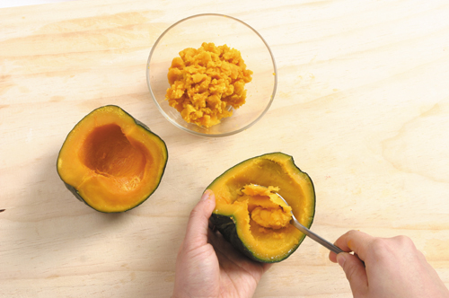 1. Lavar la calabaza, cortar a la mitad y limpiar el interior. (600 gr.)